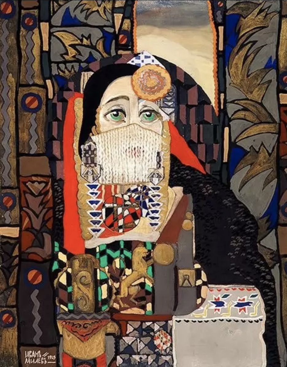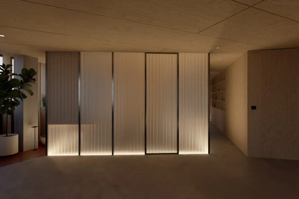 Inspired by the golden tones and arches in the painting Ahinora, the design integrates layered patterns, geometric forms, and cool tones to shape the room’s character.